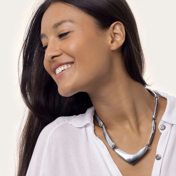 Collana filo con 8 barre. Chiusura regolabile. Realizzato a mano in alluminio 100% riciclato.