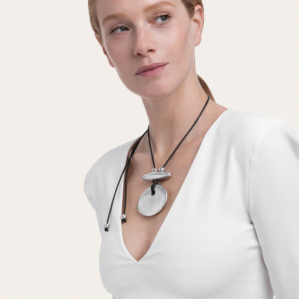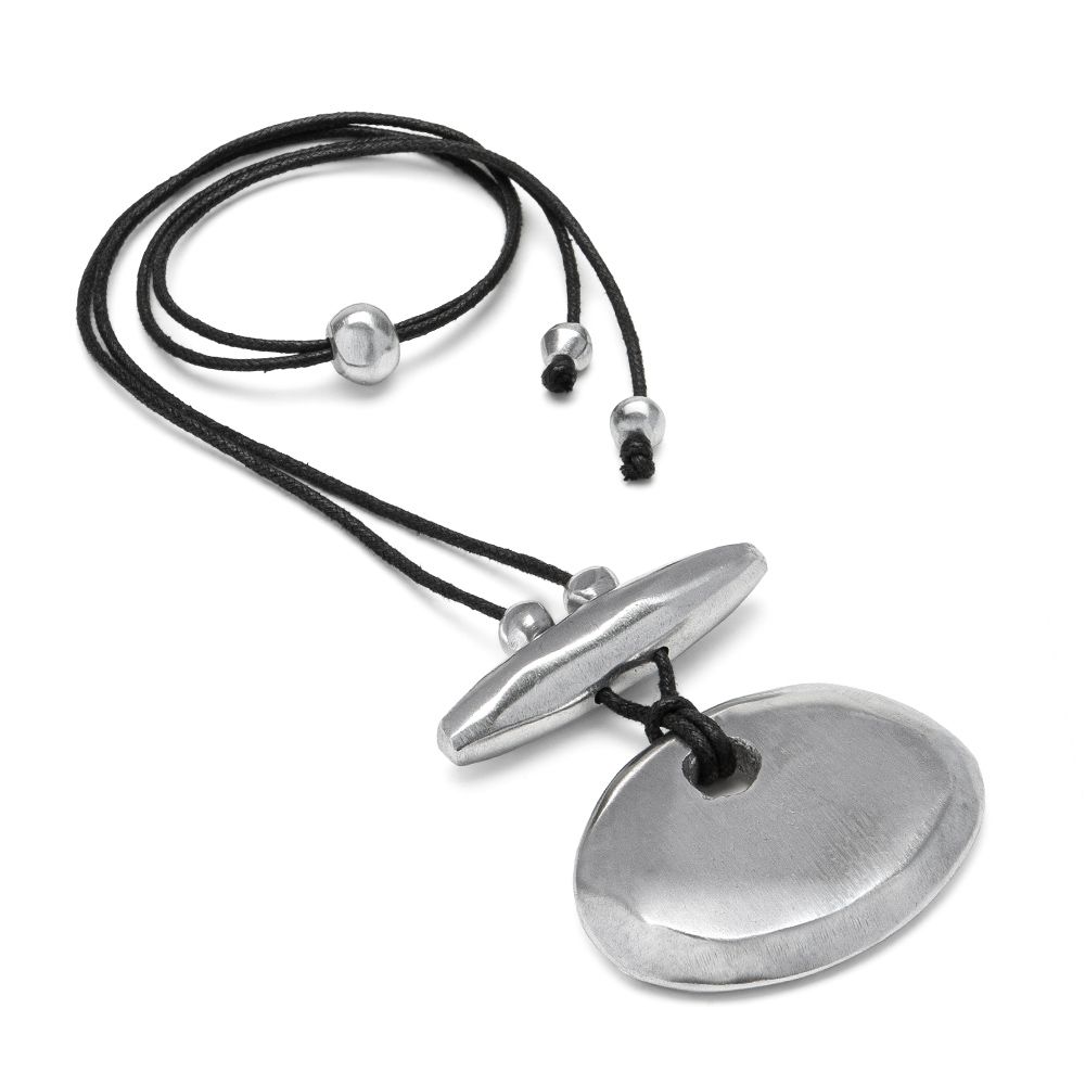 Collana filo con pendente a forma di una barra e un tondo. Misura totale del ciondolo circa 7 cm. Chiusura regolabile. Realizzato a mano in alluminio 100% riciclato.
