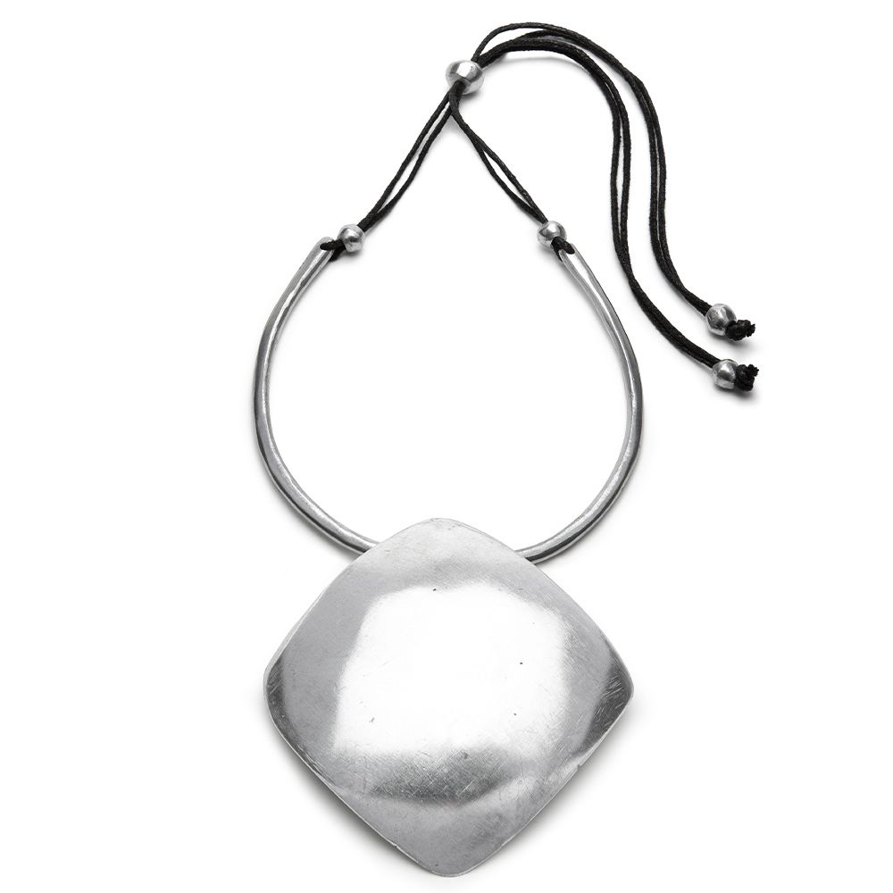 Collana rigida rombo. Misure 10 cm x 10 cm circa. Chiusura regolabile. Realizzato a mano in alluminio 100% riciclato.