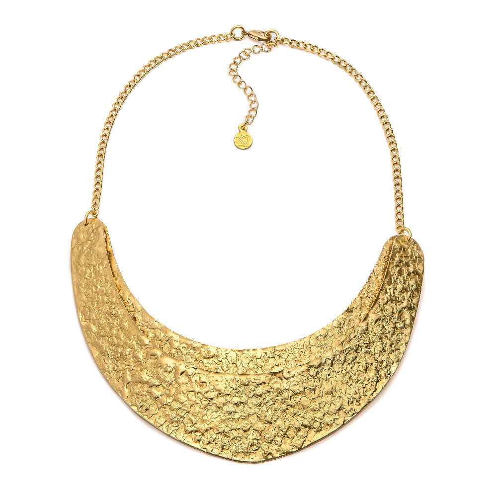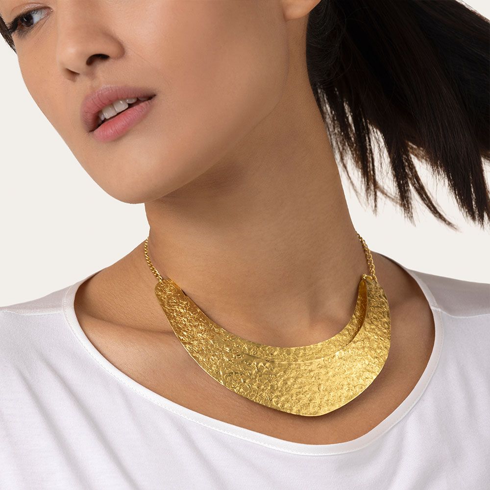 Collana modello girocollo in ottone. 2 placche mezzaluna fuse e modellate a mano per un effetto battuto. Diametro mezzaluna 16,5 cm. Chiusura regolabile con moschettone. Lunghezza 34 cm. Lunghezza extra chain 6,5 cm. Lavorazione artigianale.